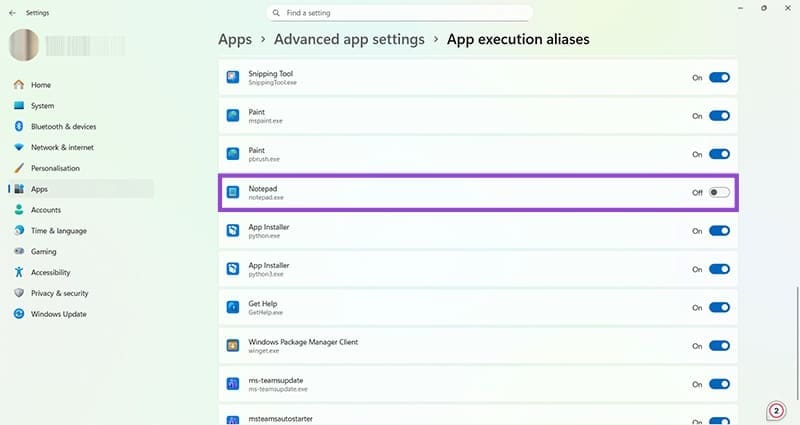 If you want the original bare-bones Notepad (pre-2022 style, no tabs or AI), disable the app execution alias. This redirects launches to the built-in classic notepad.exe.